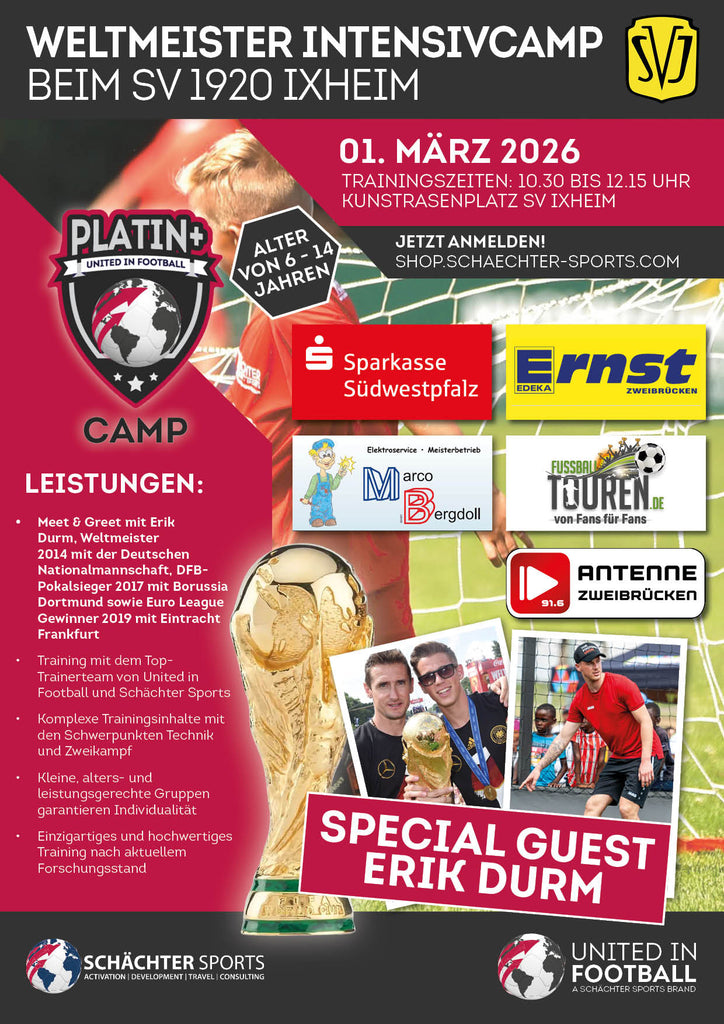 Beim SV Ixheim präsentieren wir zusammen mit unseren Partnern Sparkasse Südwestpfalz, Edeka Ernst, Fussballtouren.de, Elektro Bergdoll und Antenne Zweibrücken ein ganz besonderes Camp im Weltmeisterschaftsjahr 2026. Wir freuen und sehr, mit Erik Durm einen unserer Weltmeister 2014 in Ixheim begrüßen zu dürfen. In seiner Karriere gewann Erik außerdem den DFB-Pokal 2017 mit Borussia Dortmund sowie die Euro League 2019. Erik wird unser Training mit seiner Erfahrung unterstützen und allen Teilnehmern in einem Meet&Greet Frage und Antwort stehen.